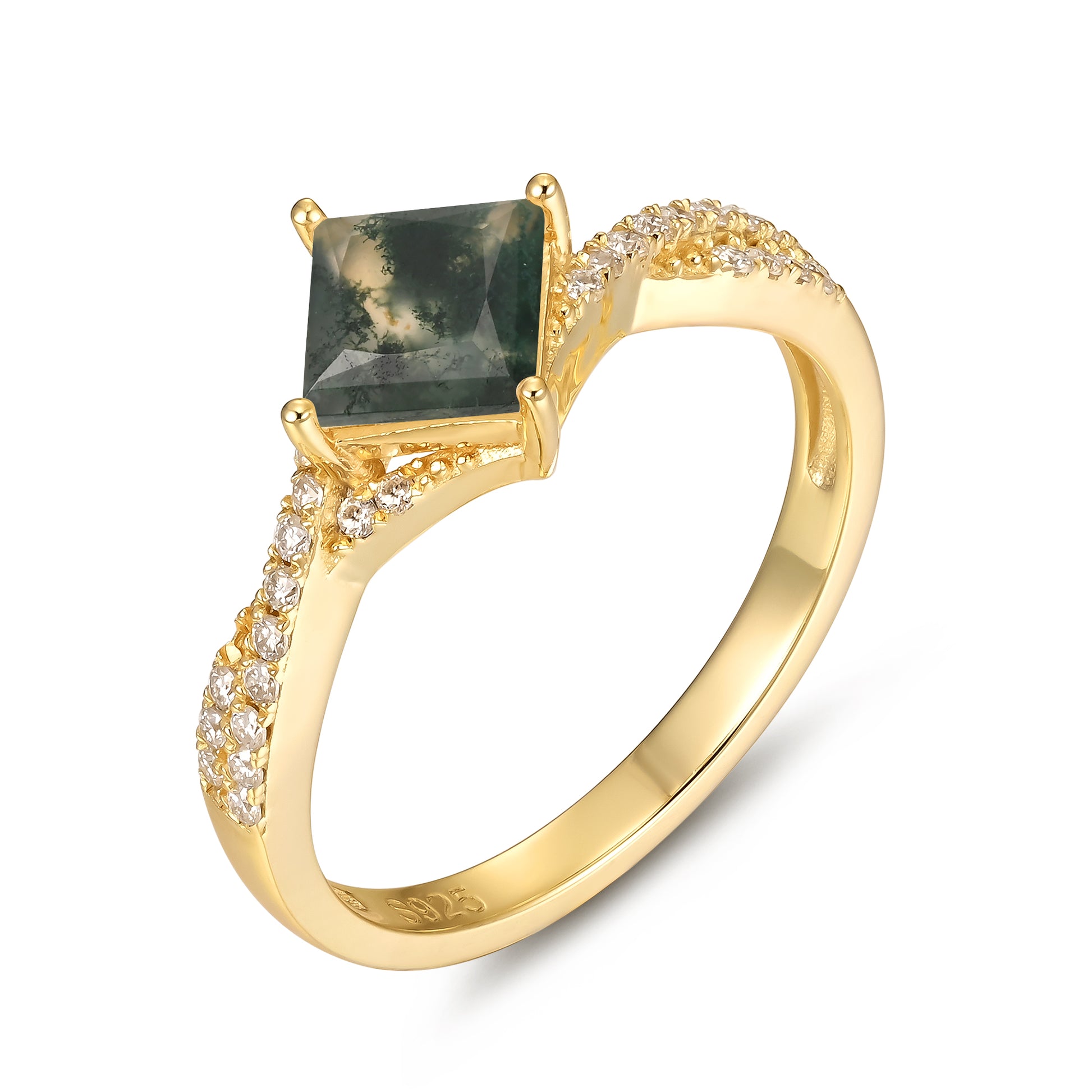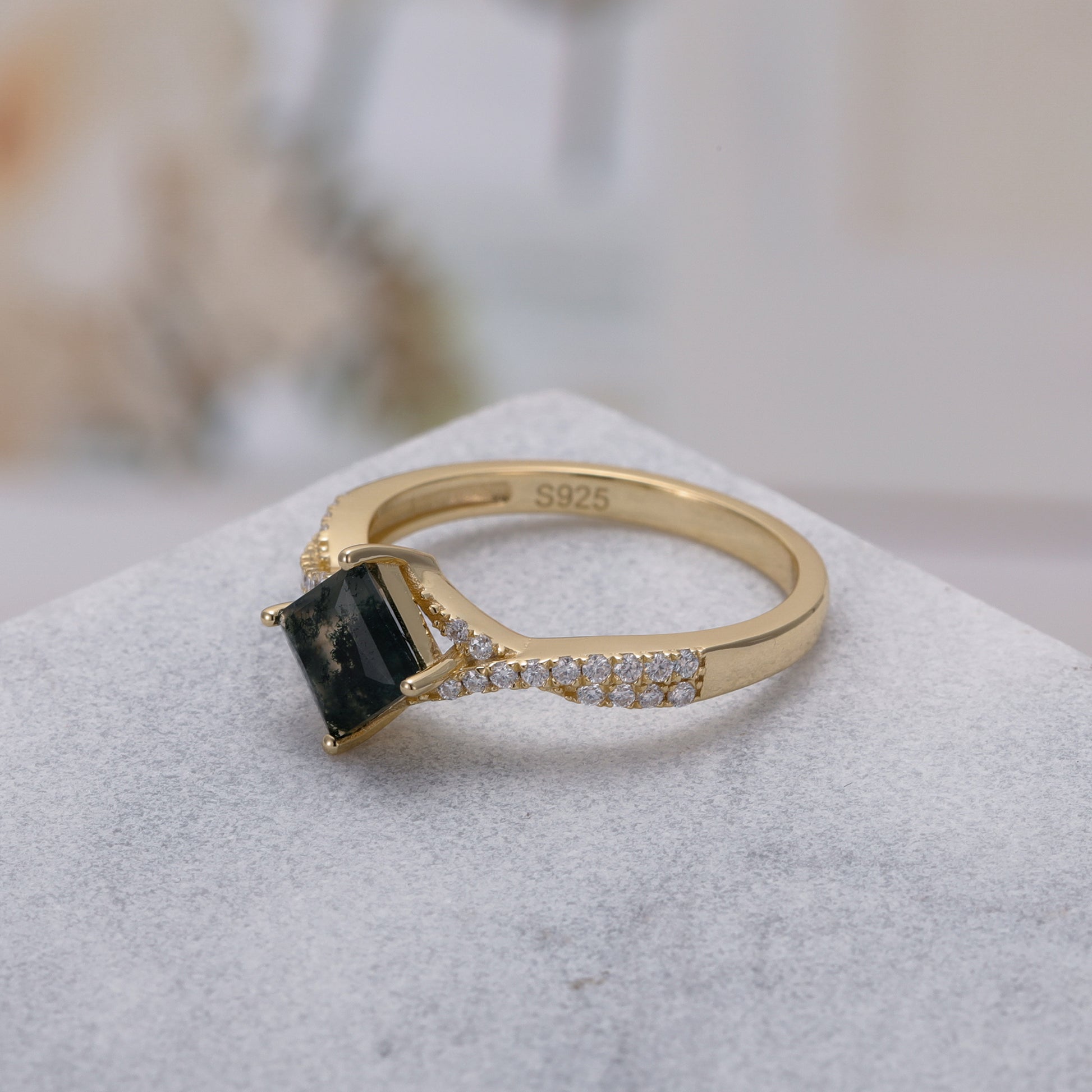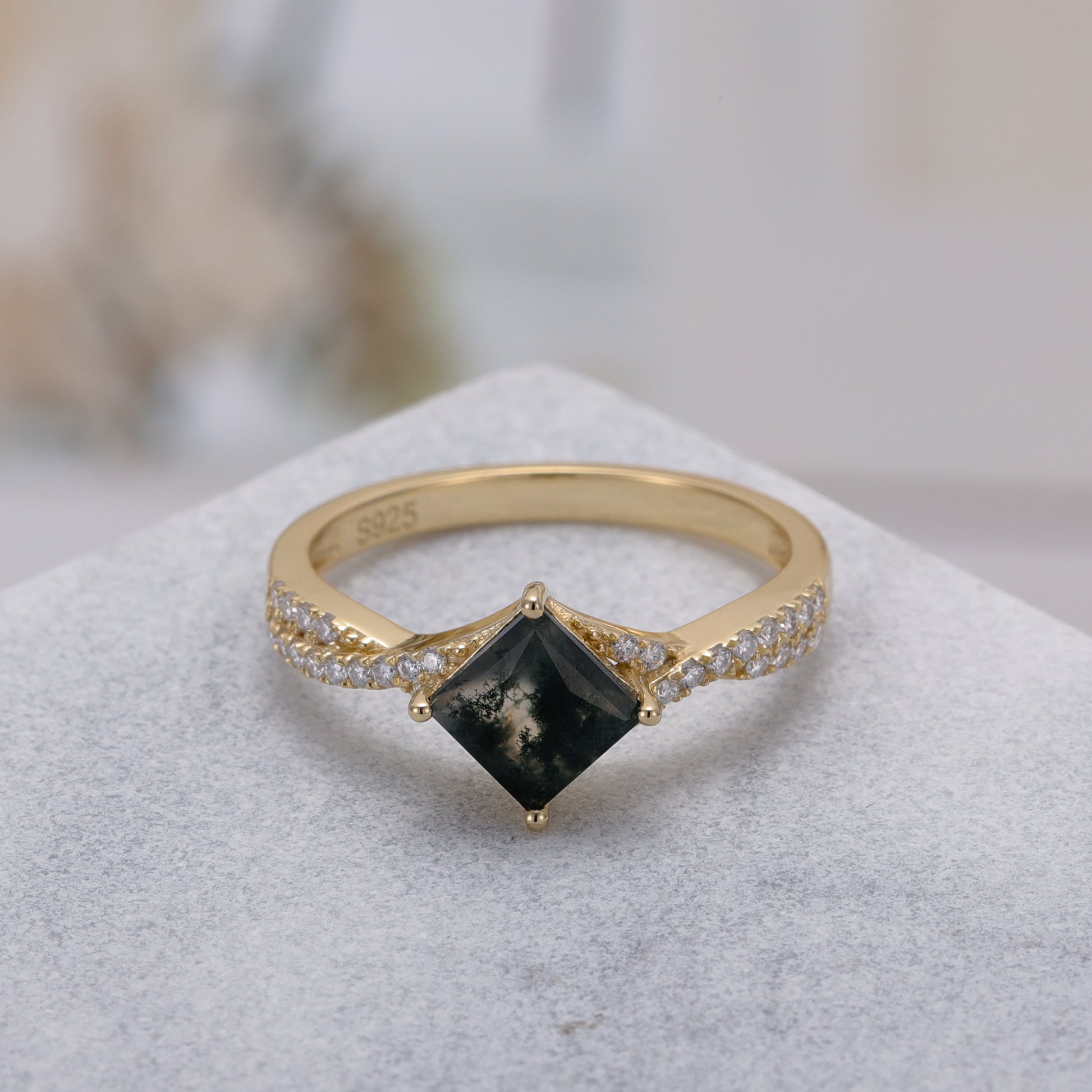 Natural Moss Agate Princess With Moissanite 925 Sterling Silver Ring
