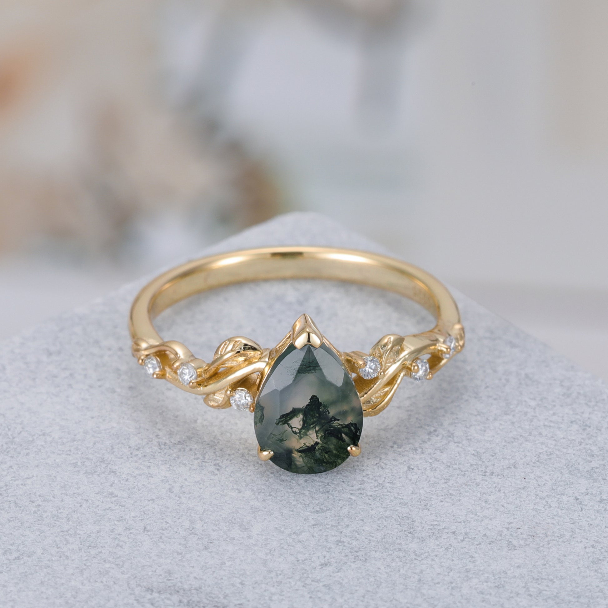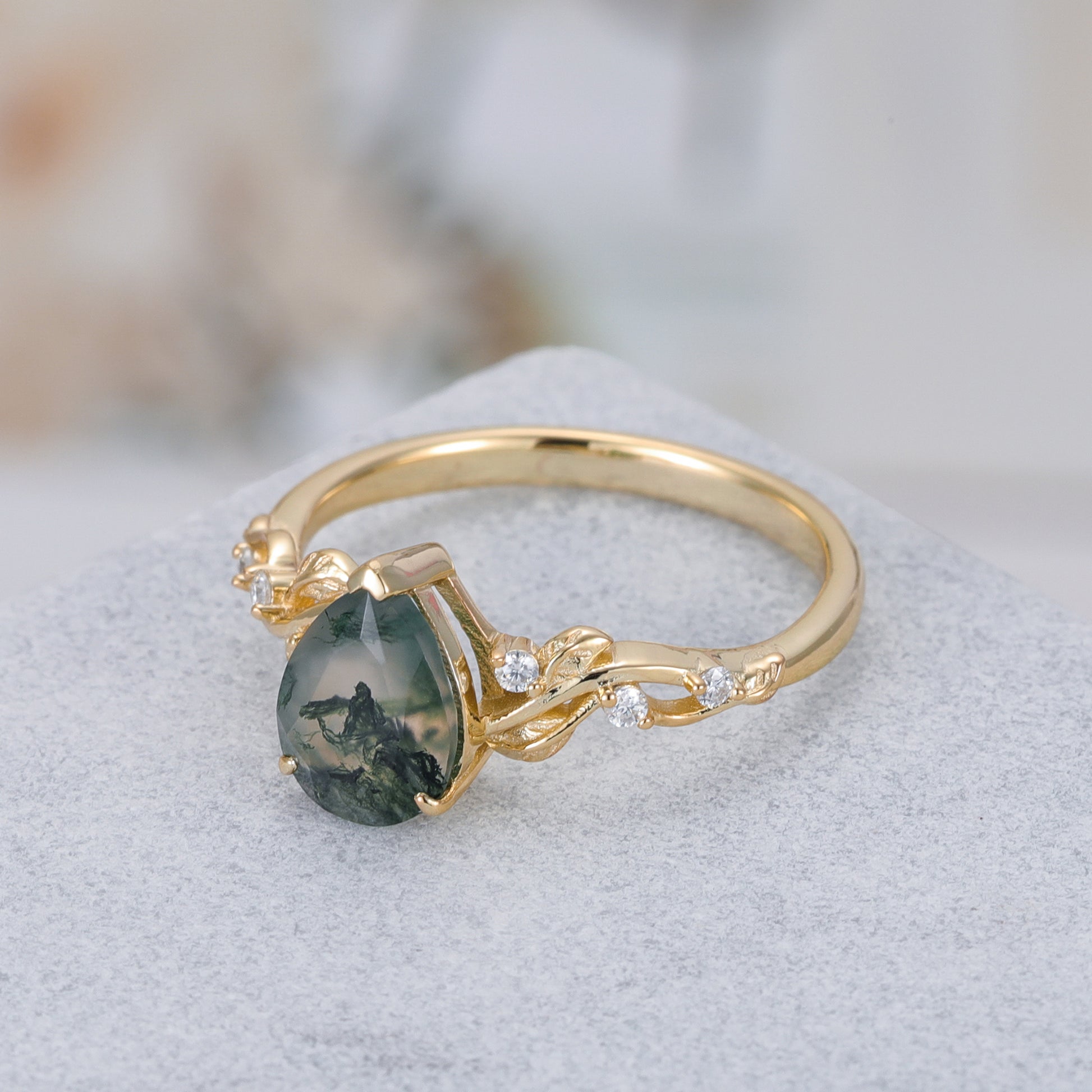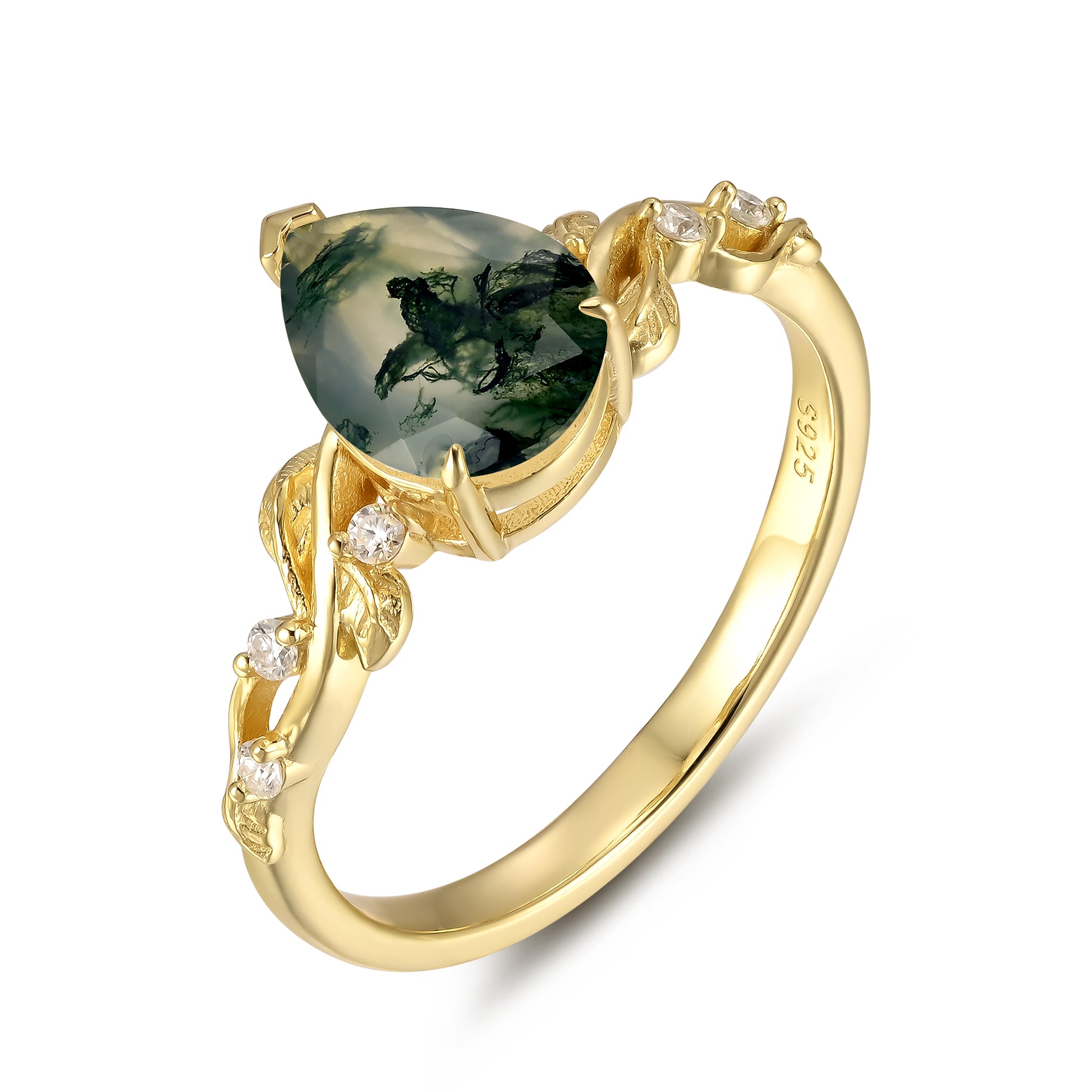Natural Moss Agate Pear With Moissanite 925 Sterling Silver Ring